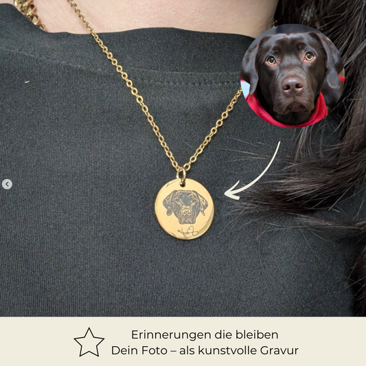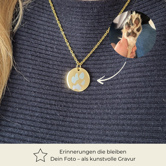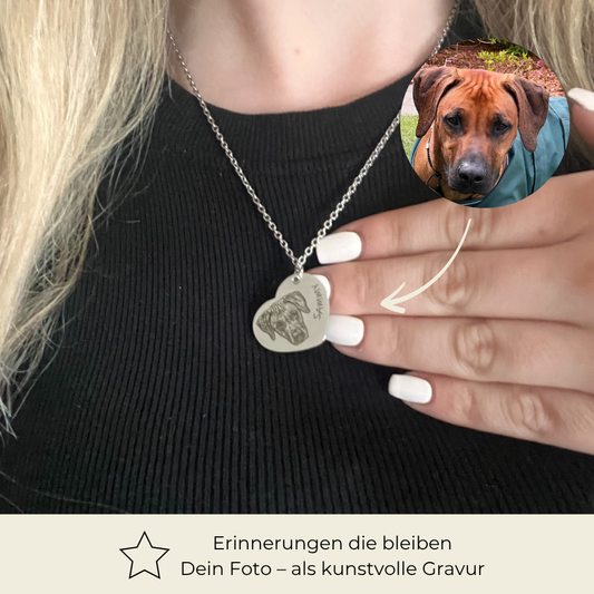 Diese personalisierte Halskette erinnert sie jeden Tag an ihre treue Fellnase – ein Stück Liebe, das sie immer bei sich trägt.
